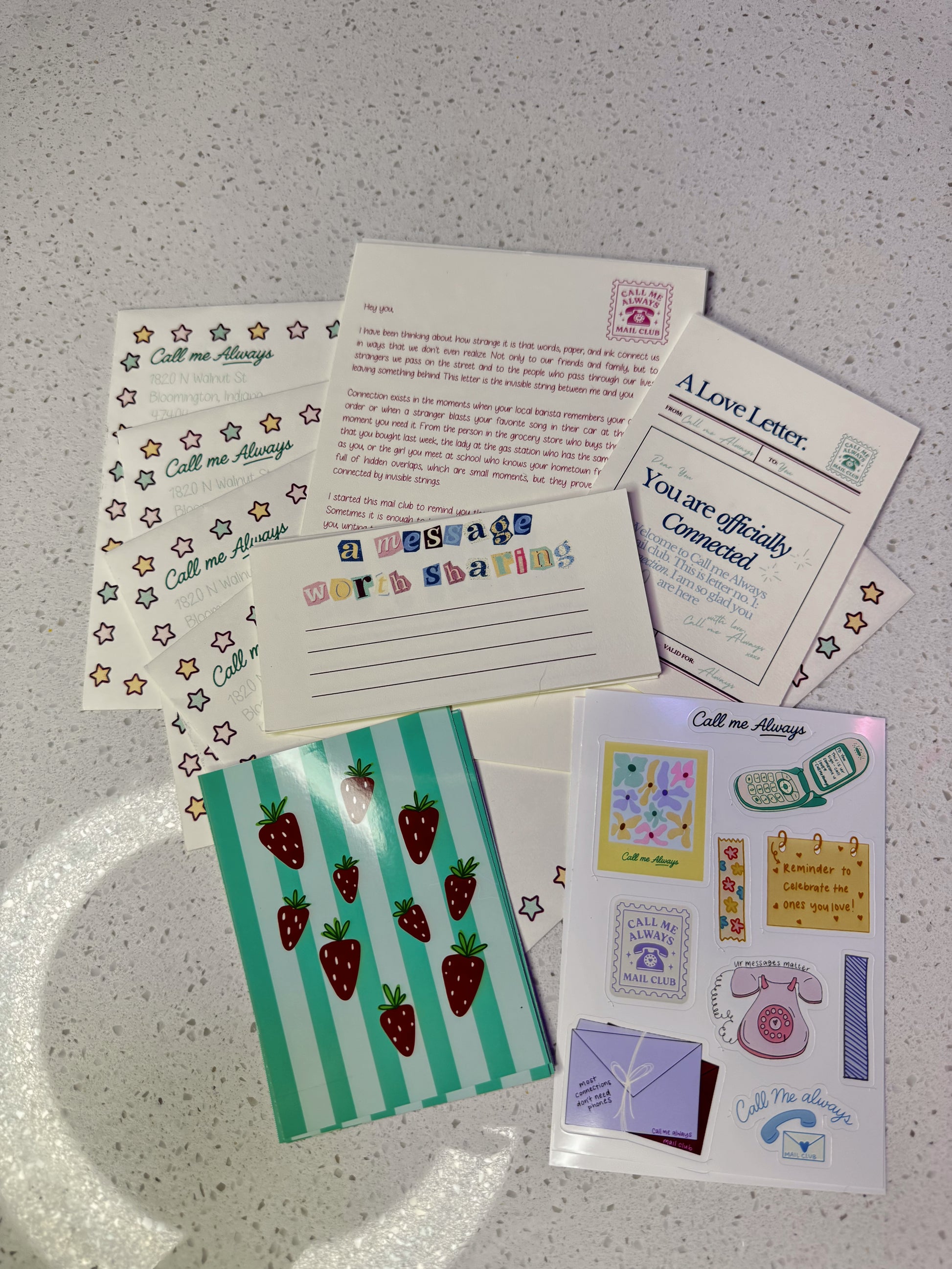 The Call Me Always Mail Club is your monthly reminder to slow down and find meaning in the little things. Each envelope is filled with messages that are worth keeping. Every month you will get a letter, stickers, and affirmations to remind you that you have someone out there thinking about you.